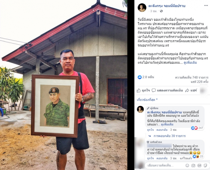 แต่เลขาของท่านนี้ที่ผมคุยต่อ คือท่านเจ้าสัวอยากติดต่อขอซื้อแล้วท่านจะขอนำไปมอบกับท่านผบ.ตร ตรงไปตามวัตถุประสงค์ของผมที่ผมอยากจะนำไปมอบแทนคำขอบคุณของประชาชนชาวไทยที่มีต่อท่าน ตามที่ผมเคยพูดไว้ ว่าภาพนี้ตัองถึงมือท่านผมเลยพร้อมรับฟังข้อเสนอ และคุยกัน