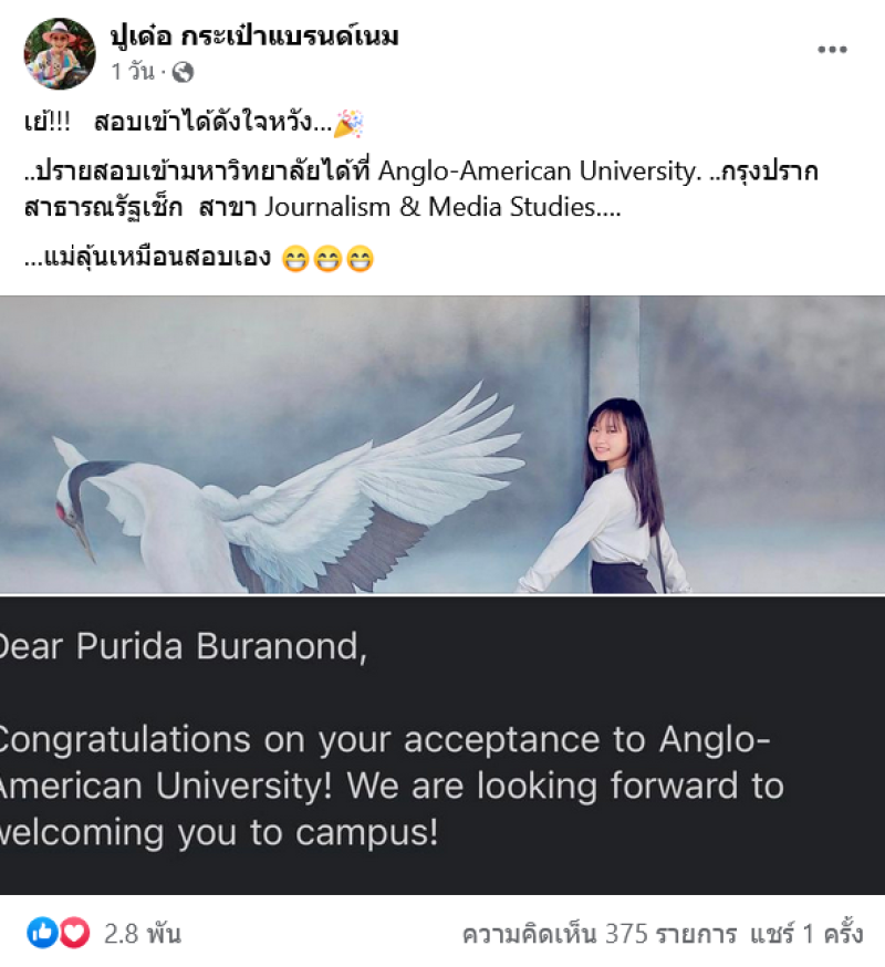 โดยได้โพสต์ในเฟซบุ๊กส่วนตัวว่า "เย้!!! สอบเข้าได้ดังใจหวัง ปรายสอบเข้ามหาวิทยาลัยได้ที่ Anglo-American University กรุงปราก สาธารณรัฐเช็ก สาขา Journalism Media Studies แม่ลุ้นเหมือนสอบเอง"