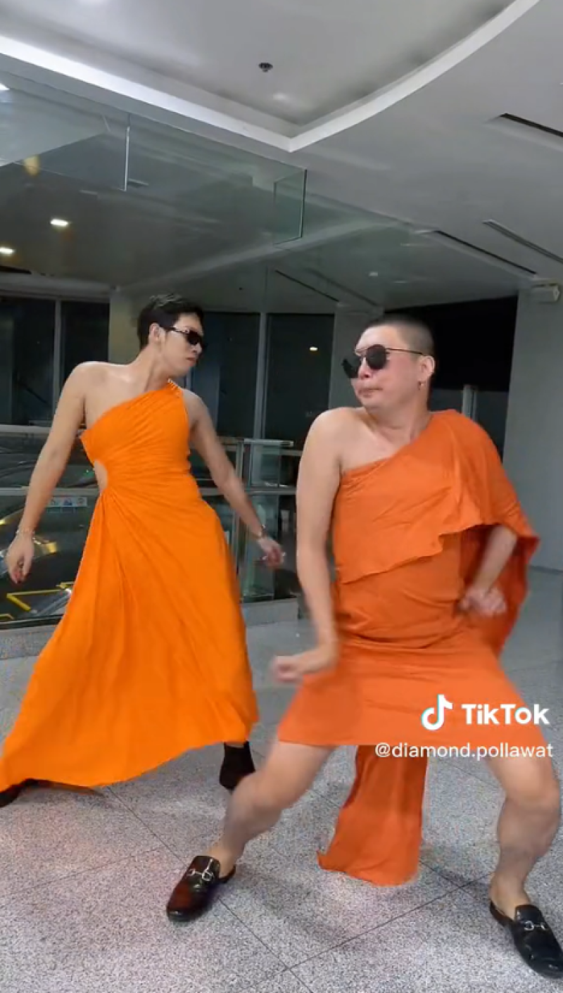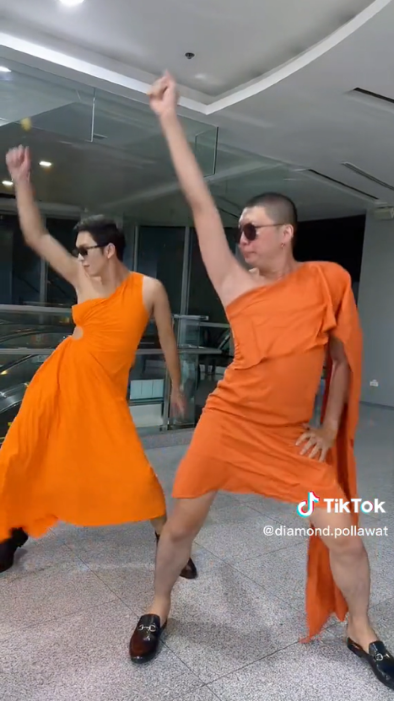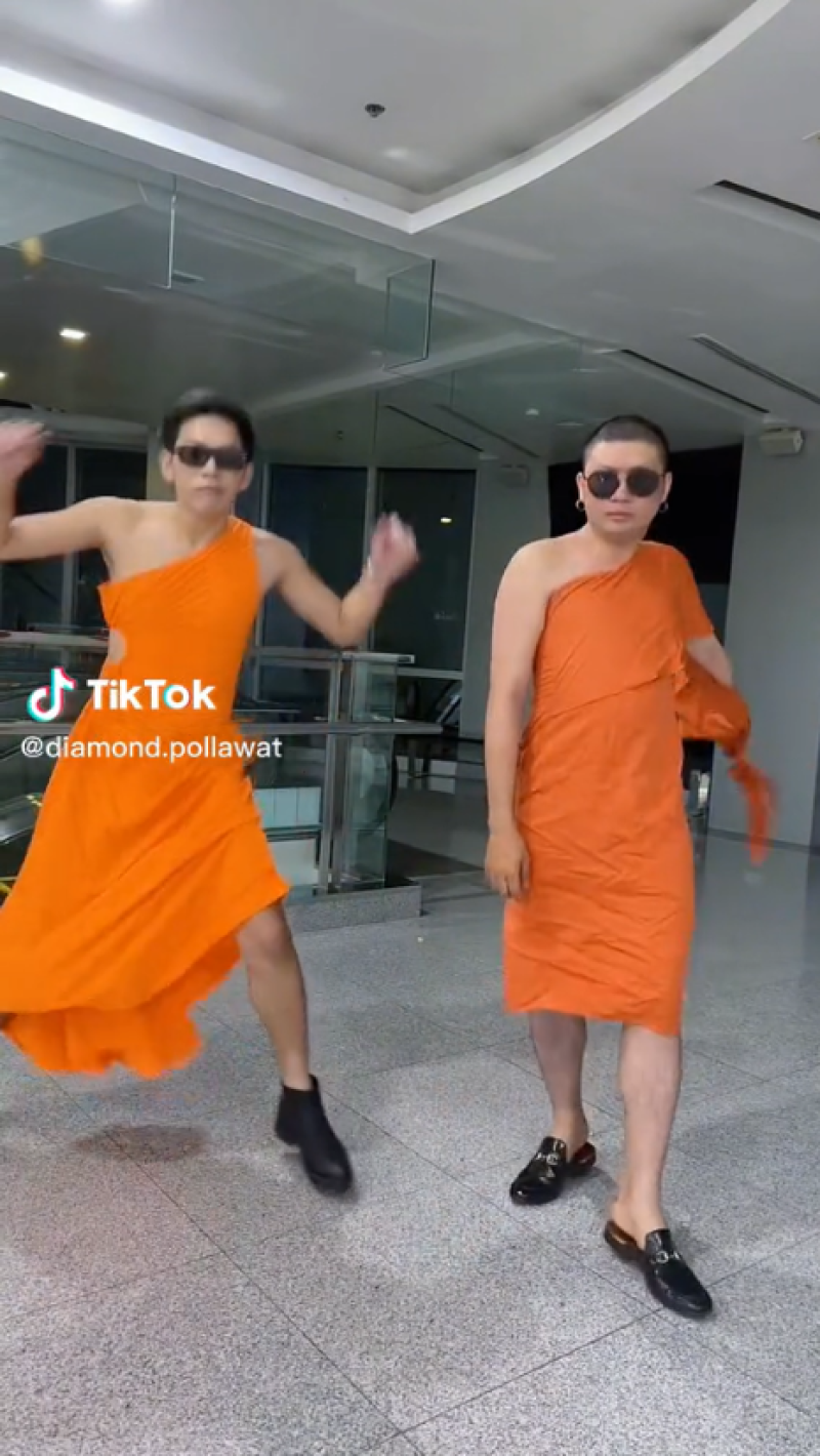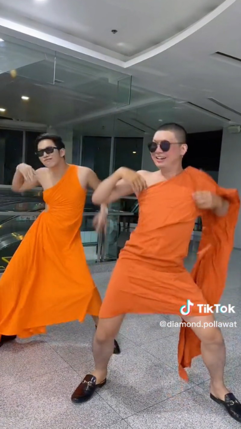 สีสันโซเชียล - เรียกได้ว่าเป็นอีกหนึ่งเรื่องราว ที่สร้างความฮือฮาเป็นอย่างมากในโลกออนไลน์ หลังจากที่ผู้ใช้บัญชี tiktok รายหนึ่ง ได้มีการโพสต์คลิปสองหนุ่ม ใส่ชุดเดรสสีส้มโชว์ลีลาแดนซ์กระจาย ซึ่งชุดดังกล่าวนั้นทำเอาหลายคนตกใจ เพราะดูคล้ายกับจีวรของพระเป็นอย่างมาก มองผ่านๆนึกว่าเป็นพระจริงๆ โดยหลังจากที่ได้มีการโพสต์คลิปออกไป ก็มีชาวโซเชียลเข้ามาแสดงความคิดเห็นกันจำนวนมาก บางคนก็เข้าใจผิดคิดว่าเป็พระก็มี