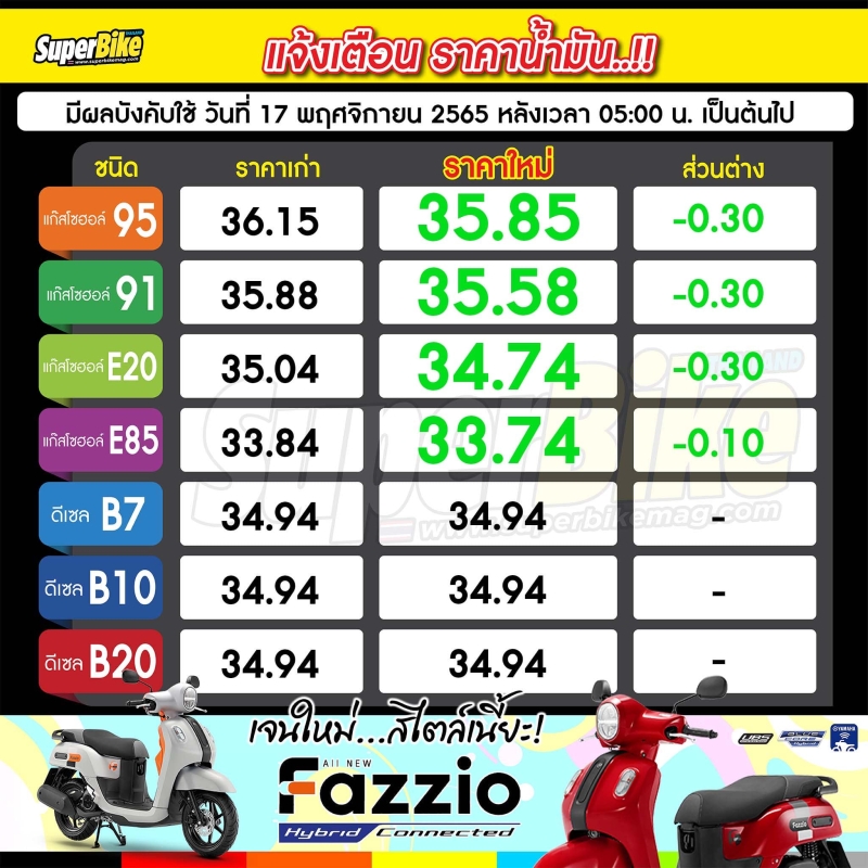 เมื่อวันที่ 16 พฤศจิกายน 2565 ในเฟซบุ๊กเพจ Superbike Magazine (Thailand's Edition) Fan Page ได้มีการแจ้งราคาน้ำมัน จะมีการปรับลงพรุ่งนี้ โดยจะมีการปรับลดราคากลุ่มน้ำมันเบนซิน กลุ่มน้ำมันเบนซิน ปรับลดราคา 0.30 สตางค์ ยกเว้น E85 ปรับลดราคา 0.10 สตางค์ มีผลบังคับใช้ วันที่ 17 พฤศจิกายน 2565 เวลา 05.00 น.