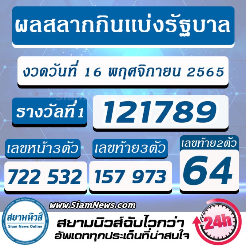 ผ่านไปแล้ว สำหรับการประกาศผลสลากกินแบ่งรัฐบาล ประจำวันที่ 16 พฤศจิกายน 2565 โดยรางวัลที่ 1 รางวัลละ 6,000,000 บาท เลขที่ออก 121789