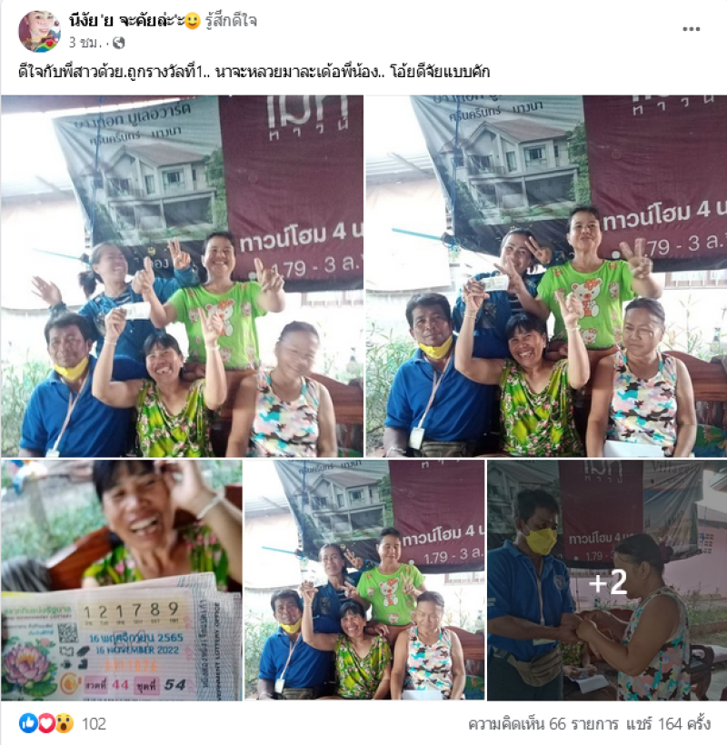 ทั้งนี้ ในโลกออนไลน์ ได้มีการแชร์ภาพหญิงถูกรางวัลที่ 1 ซึ่งทำเอาคนในบ้านต่างพากันดีใจ เรียกได้ว่าเปลี่ยนชีวิตกันเลยทีเดียว