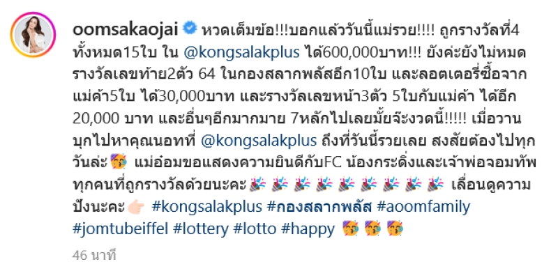 ล่าสุด อ๋อม สกาวใจ ก็ได้มีการอัปเดตว่า ถูกรางวัลหลายใบเหมือนกัน โดยถูกรางวัลที่4 ทั้งหมด15ใบ ใน kongsalakplus ได้600,000บาท!!! ยังค่ะยังไม่หมด รางวัลเลขท้าย2ตัว 64 ในกองสลากพลัสอีก10ใบ และลอตเตอรี่ซื้อจากแม่ค้า5ใบ ได้30,000บาท และรางวัลเลขหน้า3ตัว 5ใบกับแม่ค้า ได้อีก 20,000 บาท และอื่นๆอีกมากมาย 7หลักไปเลยมั้ยจ๊ะงวดนี้