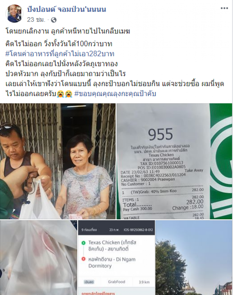 เรียกได้อีกหนึ่งเรื่องราวในความโชคร้ายยังมีความโชคดีอยู่สำหรับเรื่องราวของหนุ่มขับแกร็บรายนี้ซึ่งถูกโพสต์ไว้ในเฟซบุ๊ก โดยเค้าเล่าว่าถูกลูกค้ายกเลิกอาหารหนีหายหาไม่เจอจนมาเจอเข้ากับคุณลุง คุณป้าทั้งสองคนนี้ช่วย โดนยกเลิกงาน ลูกค้าหนีหายไปในกลีบเมฆ คิดไรไม่ออก วิ่งทั้งวันได้100กว่าบาท โดนค่าอาหารที่ลูกค้าไม่เอา282บาท คิดไรไม่ออกเลยไปนั่งหลังวัดภูเขาทองปวดหัวมาก ลุงกับป้าก็เลยมาถามว่าเป็นไรเลยเล่าให้เขาฟังว่าโดนแบบนี้ ลุงกะป้าบอกไม่ชอบกิน แต่จะช่วยซื้อ ผมนี่พูดไรไม่ออกเลยครับ ขอบคุณคุณลุงกะคุณป้าครับ