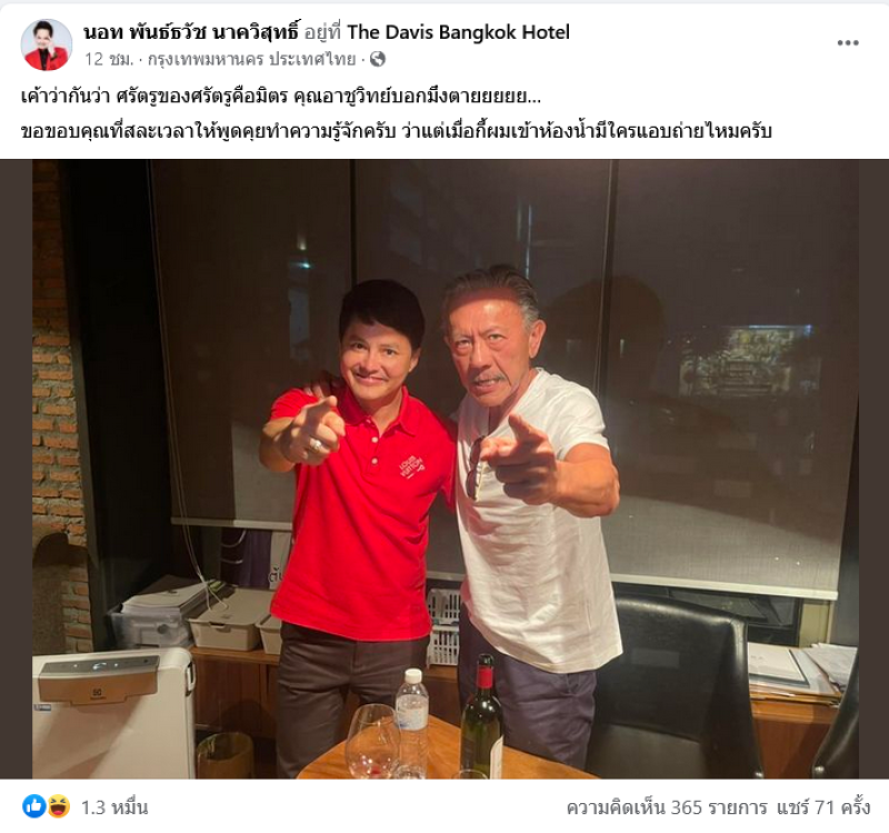 ล่าสุดในเฟซบุ๊ก นอท พันธ์ธวัช นาควิสุทธิ์ ก็ได้มีการโพสต์ภาพคู่กับ ชูวิทย์ กมลวิศิษฏ์ ซึ่งเป็นอดีตนักการเมืองชาวไทย ที่เคยออกมาเปิดโปงกลุ่มธุรกิจสีเทา พร้อมแคปชั่นเดือด งานนี้ทำเอาฮือฮากันทั้งโซเชียล รอติดตามกันว่าจะเกิดอะไรขึ้น เมื่อสองคนนี้มาเจอกัน