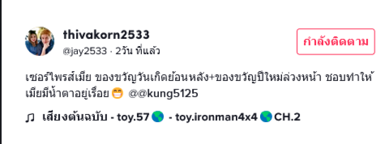 เรียกได้ว่าเป็นอีหนึ่งเรื่องราวที่สร้างรอยยิ้มและฟินกันทั้งโซเชียล หลังจากที่ผู้ใช้บัญชี Tiktok ชื่อ thivakorn2533 ได้มีการโพสต์คลิปเซอร์ไพรส์เมียระบุว่า "เซอร์ไพรส์เมีย ของขวัญวันเกิดย้อนหลัง+ของขวัญปีใหม่ล่วงหน้า ชอบทำให้เมียมีน้ำตาอยู่เรื่อย" โดยในคลิปเขาได้หลอกว่าซื้อแว่นตามาให้ พอเมียหยิบมาดูกลับกลายว่าเป็นสร้อยทอง ทำเอาเมียถึงกับยิ้มไม่หุบ พร้อมกับหยอดคำหวานว่า เงินทองเป็นของมีค่า แต่ก็ไม่มากไปกว่าข้ารักเอง จะซื่อสัตย์กับเอ็งตลอดไป ซึ่งหลังจากที่ได้มีการโพสต์ออกไป ก็ทำเอาชาวโซเชียลแห่เข้าคอมเม้นท์ ชื่นชมกันเป็นจำนวนมาก