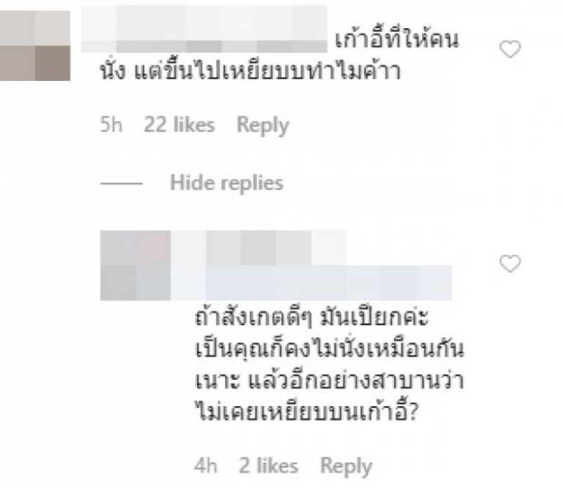 แต่เมื่อเจอด้านดี ก็เจอกระแสตีกลับ เมื่อมีชาวโซเชียลท่านหนึ่งได้คอมเมนต์ว่า เก้าอี้ที่ให้คนนั่ง แต่ขึ้นไปเหยียบบทำไมค้าา แฟนคลับท่านหนึ่งตอบว่า ถ้าสังเกตดีๆ มันเปียกค่ะ เป็นคุณก็คงไม่นั่งเหมือนกันเนาะ แล้วอีกอย่างสาบานว่าไม่เคยเหยียบบนเก้าอี้