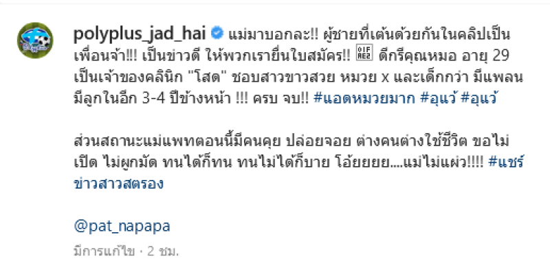 ล่าสุดในอินสตาแกรม polyplus_jad_hai ก็ได้ออกมาบอกแล้วว่า ผู้ชายที่สาวแพทเต้นด้วยในครลิปดังกล่าวนั้น เป็นแค่เพื่อนกันจ้า