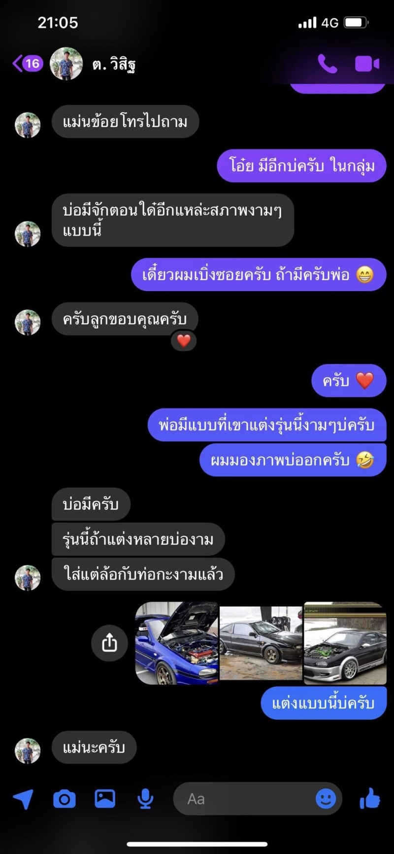 ผมก็เลยคิดเซอร์ไพรส์ แอบทักไปซื้อก่อน ตอนนั้นพ่อโทรมาตัดพ้อ บอกเสียดายมาก เพราะรถหายากด้วย ผ่านมาเป็นเดือนพ่อไม่คิดว่าวันนี้ลูกจะเอารถคันที่อยากได้มาให้เป็นของขวัญ พร้อมแต่งให้ใหม่นิดหน่อยตามสเปคที่แอบถามพ่อนะครับ