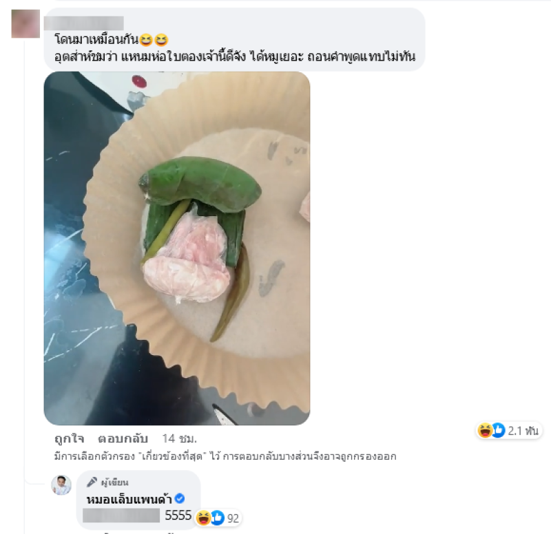 เรียกได้ว่าทำเอาฮาลั่นกันทั้งโซเชียล เมื่อเฟซบุ๊กเพจ หมอแล็บแพนด้า ได้มีการโพสต์ภาพแหนมห่อใบตอง ซึ่งในตอนแรกดูเหมือนว่าจะได้แหนมก้อนใหญ่ แต่พอแกะใบตองออกมาเท่านั้น ความจริงคือได้แค่นิดเดียว ซึ่งหลายคนก็คงจะเคยซื้อแหนมแล้วเจอลักษณะแบบนี้เช่นเดียวกัน โดยหลังจากที่ได้มีการโพสต์ภาพ ก็มีชาวโซเชียลเข้ามาแสดงความคิดเห็นเพิ่มเติมว่าเจอแบบนี้เหมือนกัน ต่อไปคิดจะซื้อแหนมคงต้องดูกันให้ดีแล้วล่ะ