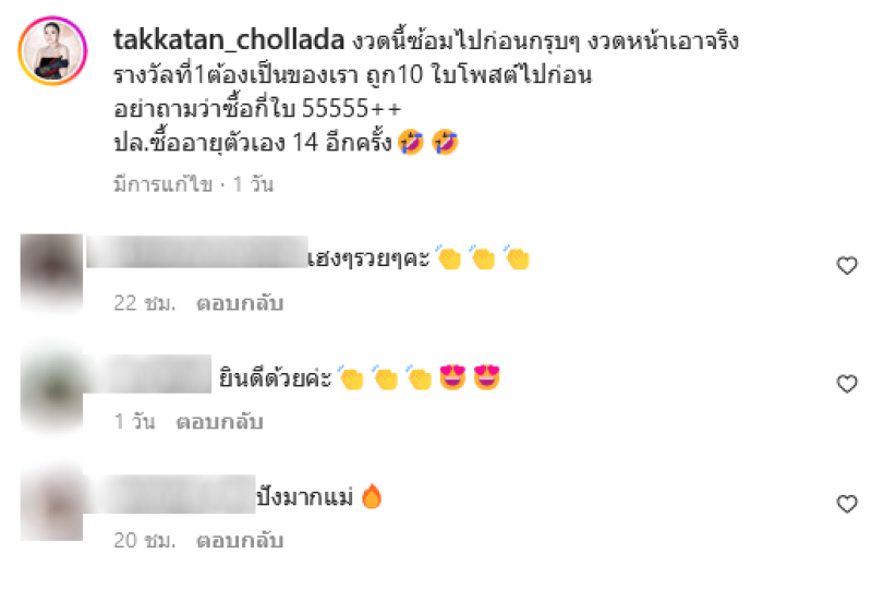 ล่าสุดดูเหมือนว่าผลบุญจะหนุนนำสาวตั๊กแตน เมื่อเจ้าตัวได้มีการโพสต์ภาพรางวัลลอตเตอรี่ ซึ่งเจ้าตัวนั้นถูกรางวัลกว่า 10 ใบ โดยสาวตั๊กแตนได้โพสต์ว่า "งวดนี้ซ้อมไปก่อนกรุบๆ งวดหน้าเอาจริง รางวัลที่1ต้องเป็นของเรา ถูก10 ใบโพสต์ไปก่อน อย่าถามว่าซื้อกี่ใบ 55555++ ปล.ซื้ออายุตัวเอง 14 อีกครั้ง" ท่ามกลางแฟนๆที่เข้ามาแสดงความยินดีกับสาวตั๊กแตน