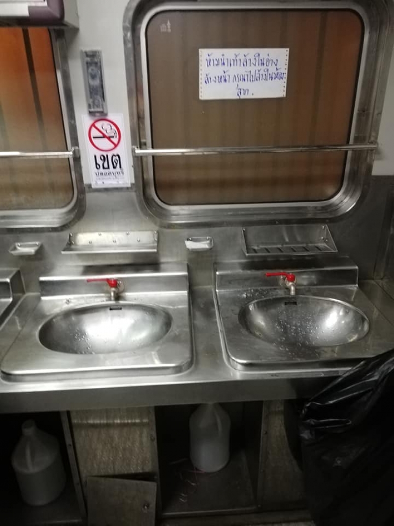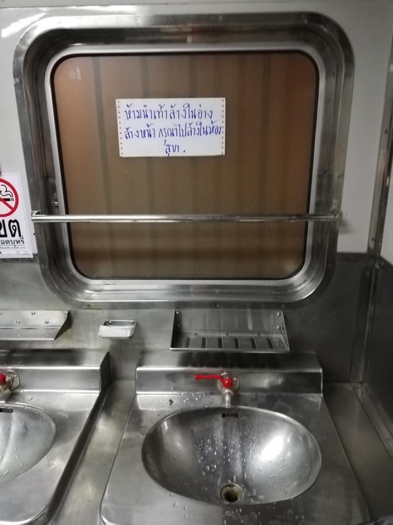 ผู้ใช้บริการรถไฟโดยสารถึงกับงง หลังเจอข้อความติดไว้บนอ่างล้างหน้า