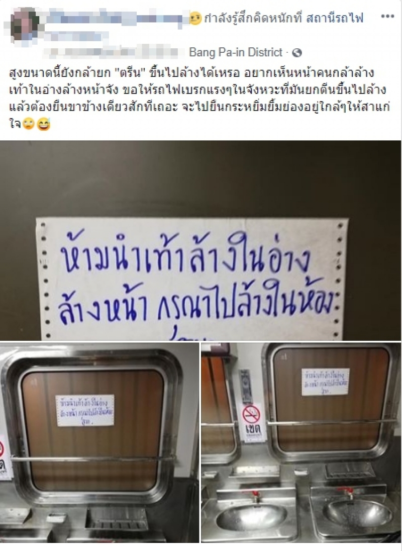 โดยผู้ใช้เฟสบุ๊ครายนี้ได้โพสต์ภาพพร้อมระบุข้อความว่า สูงขนาดนี้ยังกล้ายก ขึ้นไปล้างได้เหรอ อยากเห็นหน้าคนกล้าล้างเท้าในอ่างล้างหน้าจัง ขอให้รถไฟเบรกแรงๆในจังหวะที่มันยกตีนขึ้นไปล้างแล้วต้องยืนขาข้างเดียวสักทีเถอะ จะไปยืนกระหยิ่มยิ้มย่องอยู่ใกล้ๆให้สาแก่ใจ