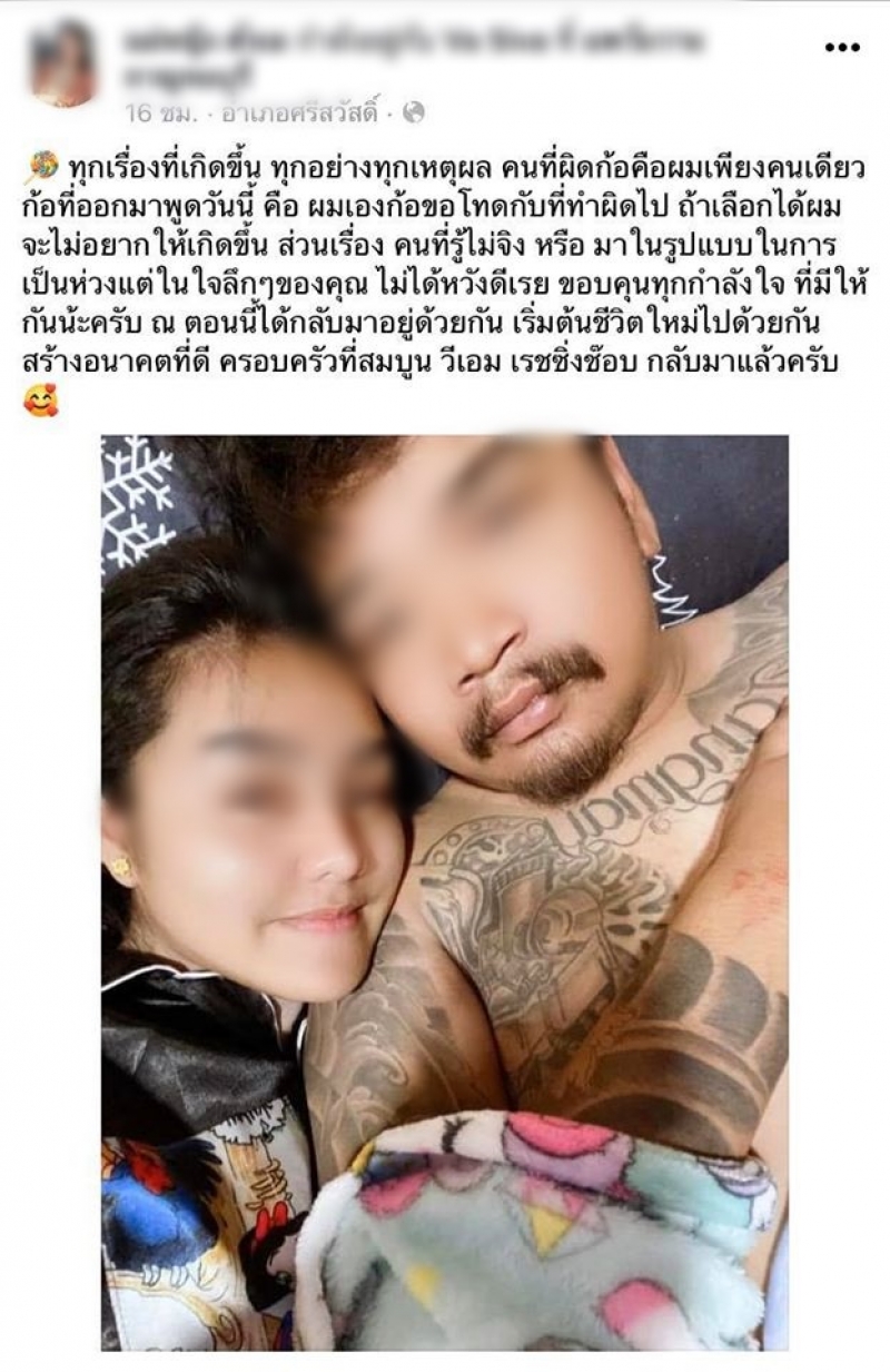 โดยเธอกล่าวว่า ทุกเรื่องที่เกิดขึ้น ทุกอย่างทุกเหตุผล คนที่ผิดก้อคือผมเพียงคนเดียว ก็ที่ออกมาพูดวันนี้ คือ ผมเองก้อขอโทษกับที่ทำผิดไป ถ้าเลือกได้ผมจะไม่อยากให้เกิดขึ้น ส่วนเรื่อง คนที่รู้ไม่จริง หรือ มาในรูปแบบในการ เป็นห่วงแต่ในใจลึกๆของคุณ ไม่ได้หวังดีเรย ขอบคุนทุกกำลังใจ ที่มีให้กันน่ะครับ ณ ตอนนี้ได้กลับมาอยู่ด้วยกัน เริ่มต้นชีวิตใหม่ไปด้วยกัน สร้างอนาคตที่ดี ครอบครัวที่สมบูรณ วีเอม เรชซิ่งช๊อบ กลับมาแล้วครับ