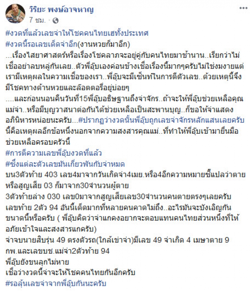 โดยในเฟซบุ๊ก วิริยะ พงษ์อาจหาญ โพสต์ข้อความระบุว่า ครั้งที่แล้วเลขให้โชคคนไทยเฮทั้งประเทศ ครั้งนี้รอเลขอีก ตัวพี่อุ๊บเองค่อนข้างเชื่อเรื่องนี้มากๆครับไม่ใช่งมงายแต่เรามีเหตุผลในความเชื่อของเรา พี่อุ๊บจะมีเซ็นท์ในการตีตัวเลข ด้วยเหตุนี้จึงมีโชคทางด้านเลขและล๊อตตอรี่อยู่บ่อยๆ