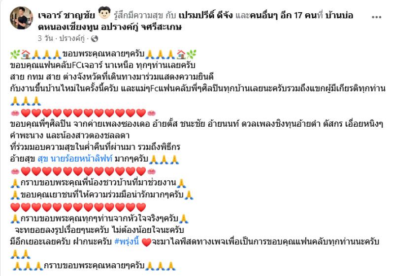 ทั้งนี้ ในงานคอนเสิร์ตขึ้นบ้านใหม่ของหนุ่มเจอาร์ ก็ได้มีแฟนเพลง นำพวงมาลัยเงินมามอบให้กับหนุ่มเจอาร์จนคลุมไปทั้งตัว เรียกได้ว่างานนี้ทำเอาหายเหนื่อย ถือว่าเป็นรางวัลของความกตัญญูสำหรับนักร้องหนุ่มคนนี้