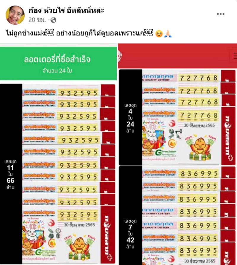 เรียกได้ว่าทำเอาแฟนๆได้ฮือฮากันอีกครั้ง สำหรับนักร้องหนุ่มขวัญใจมหาชนอย่าง ก้อง ห่วยไร่ ที่ขึ้นคอนเสิร์ตทีไรแฟนเพลงก็จะแห่นำพวงมาลัยมาให้จนล้นเวที ล่าสุดเจ้าก็ได้มีการโพสต์ภาพลอตเตอรี่ที่ทุ่มซื้อ ให้แฟนๆได้ดูเป็นแนวทาง ในเฟซบุ๊ก ก้อง ห้วยไร่ อีหลีหนิ่หล่ะ งานนี้แฟนๆต่างเข้ามาคอมเมนต์กันเพียบ ซึ่งก็ใกล้เข้ามาทุกทีแล้วสำหรับวันประกาศผลสลากกินแบ่งรัฐบาลงวดสุดท้ายของปี