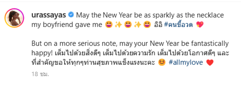 "But on a more serious note, may your New Year be fantastically happy! เต็มไปด้วยสิ่งดีๆ เต็มไปด้วยความรัก เต็มไปด้วยโอกาศดีๆ และที่สำคัญขอให้ทุกๆท่านสุขภาพแข็งแรงนะคะ #allmylove"