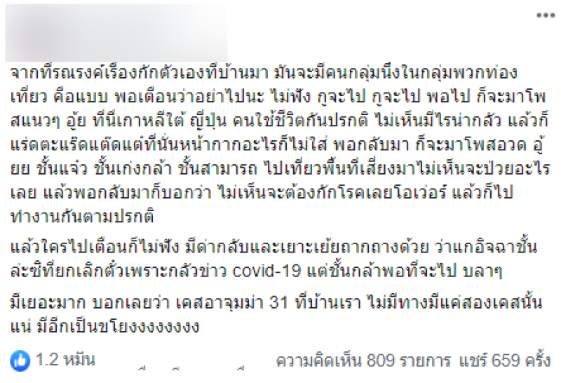 แล้วก็หน้ากากอะไรก็ไม่ใส่ พอกลับมา ก็จะมาโพสอวด อู้ย ชั้นแจ๋ว ชั้นเก่งกล้า ชั้นสามารถ ไปเที่ยวพื้นที่มาไม่เห็นจะเป็นอะไรเลย แล้วพอกลับมาก็บอกว่า ไม่เห็นจะต้องกันเลยโอเว่อร์ แล้วก็ไปทำงานกันตามปกติ