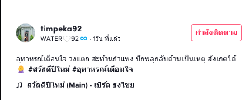 หนุ่มโพสต์เตือน "อุทาหรณ์เตือนใจ วงแตก สะท้านกำแพง ปักพลุกลับด้านเป็นเหตุ สังเกตได้" ในโลกออนไลน์ผู้ใช้ tiktok ชื่อ timpeka92 ได้มีการโพสต์คลิปเตือนใครที่เล่นพลุ ให้อ่านวิธีการเล่นให้ดีไม่อย่างนั้นจะเป็นแบบนี้ โดยครอบครัวนี้ได้จุดพลุฉลองที่บ้าน แต่ดันตั้งพลุกลับด้าน ทำให้พลุพุ่งลงพื้น กระเด็นไปมาในบ้าน ทำเอาวงแตกกันกระเจิง ซึ่งถือว่าเป็นอีกหนึ่งเรื่องที่ต้องเตือนกัน