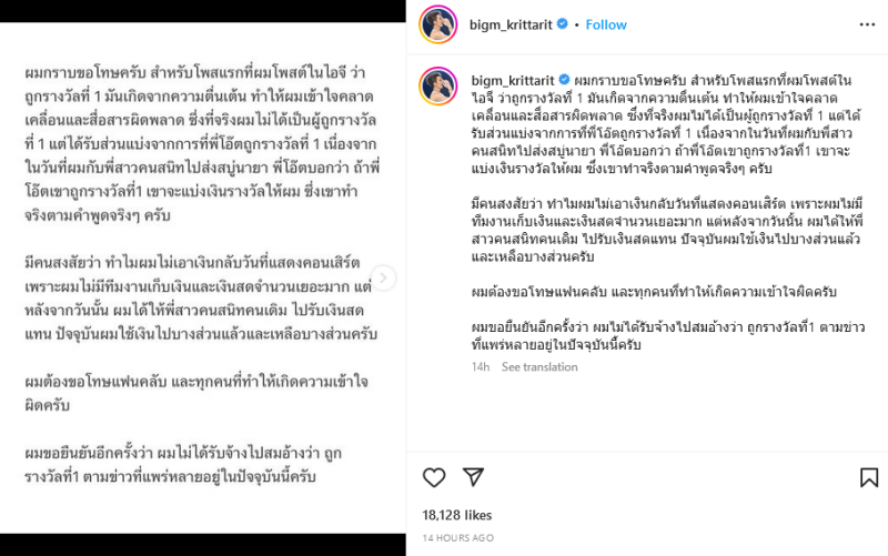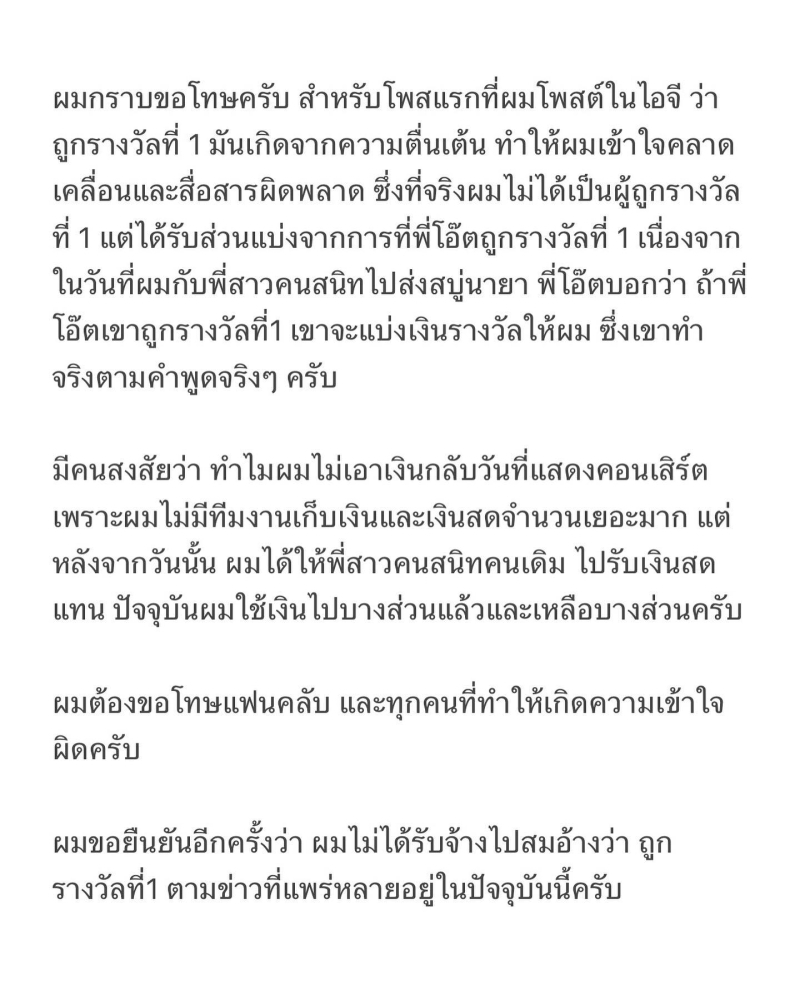 จากกรณีที่บิ๊กเอ็ม พระเอกหนุ่มก็ได้โพสต์ผ่านไอจี bigm_krittarit พร้อมยอมรับว่าไม่ได้ถูกรางวัลจริง โดยได้ระบุข้อความว่า ผมกราบขอโทษครับ สำหรับโพสต์แรกที่ผมโพสต์ในไอจี ว่าถูกรางวัลที่ 1 มันเกิดจากความตื่นเต้น ทำให้ผมเข้าใจคลาดเคลื่อนและสื่อสารผิดพลาด ซึ่งที่จริงผมไม่ได้เป็นผู้ถูกรางวัลที่ 1 แต่ได้รับส่วนแบ่งจากการที่พี่โอ๊ตถูกรางวัลที่ 1 เนื่องจากในวันที่ผมกับพี่สาวคนสนิทไปส่งสบู่นายา พี่โอ๊ตบอกว่า ถ้าพี่โอ๊ตเขาถูกรางวัลที่1 เขาจะแบ่งเงินรางวัลให้ผม ซึ่งเขาทำจริงตามคำพูดจริงๆ ครับ มีคนสงสัยว่า ทำไมผมไม่เอาเงินกลับวันที่แสดงคอนเสิร์ต เพราะผมไม่มีทีมงานเก็บเงินและเงินสดจำนวนเยอะมาก แต่หลังจากวันนั้น ผมได้ให้พี่สาวคนสนิทคนเดิม ไปรับเงินสดแทน ปัจจุบันผมใช้เงินไปบางส่วนแล้วและเหลือบางส่วนครับ ผมต้องขอโทษแฟนคลับ และทุกคนที่ทำให้เกิดความเข้าใจผิดครับ ผมขอยืนยันอีกครั้งว่า ผมไม่ได้รับจ้างไปสมอ้างว่า ถูกรางวัลที่1 ตามข่าวที่แพร่หลายอยู่ในปัจจุบันนี้ครับ