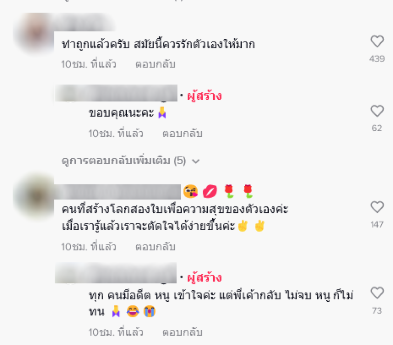 หลังจากที่ได้มีการโพสต์ออกไป ก็มีชาวโซเชียลเข้ามาให้กำลังใจกันเป็นอย่างมาก อาทิเช่น "คนที่สร้างโลกสองใบเพื่อความสุขของตัวเองค่ะ เมื่อเรารู้แล้วเราจะตัดใจได้ง่ายขึ้นค่ะ"พอหยุดแค่นี้แหละอย่าไปต่อเลยเชื่อผม"