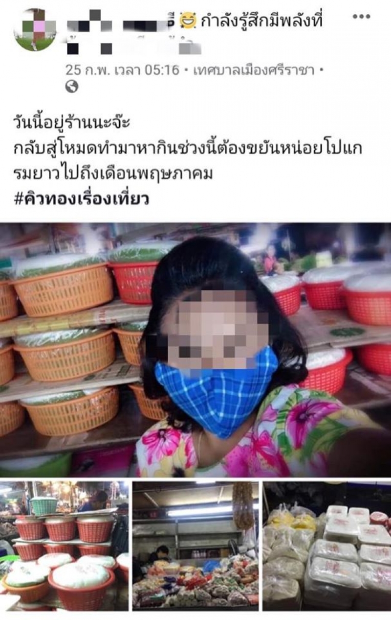 วันที่ 27 กุมภาพันธ์ 2563 เพจเฟซบุ๊ก Red Skull Society ได้ออกมาโพสต์เรื่องราวของแม่ค้าสาวรายหนึ่ง ที่เพิ่งเดินทางไปเที่ยว ญี่ปุ่น แต่พอกลับมาไทย ดันไม่ยอมหยุดพัก ในระยะเวลา 14 วัน โดยเธอได้โพสต์ข้อความหลังจากกลับมาขายของที่ตลาดสดใน อำเภอศรีราชา จังหวัดชลบุรี ระบุว่า วันนี้อยู่ร้านนะจ๊ะ กลับสู่โหมดทำมาหากินช่วงนี้ต้องขยันหน่อยโปแกรมยาวไปถึงเดือนพฤษภาคม คิวทองเรื่องท่องเที่ยว