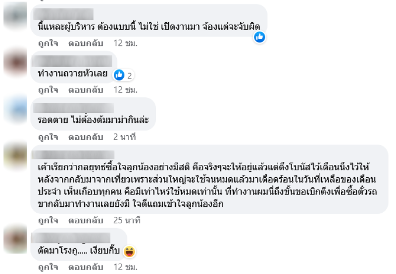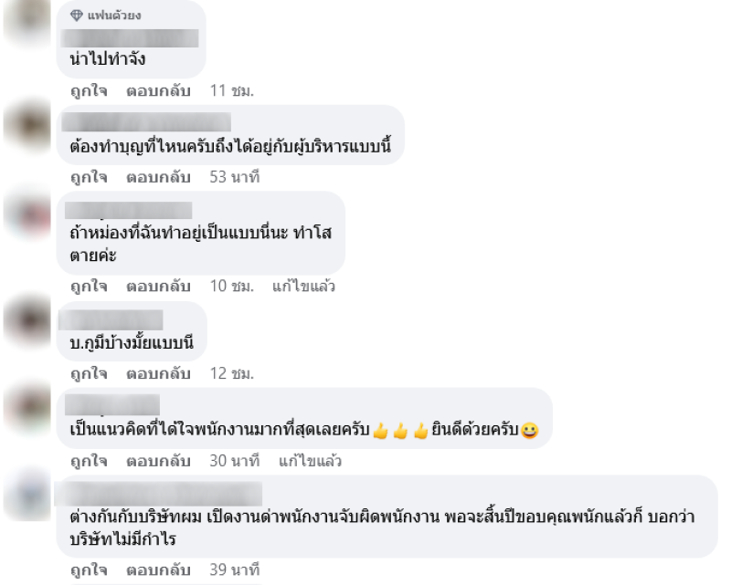 โดยหลังจากที่ได้มีการเผยคลิป ก็มีชาวโซเชียลเข้ามาแสดงความคิดเห็นชื่นชมเป็นอย่างมาก อาทิเช่นได้ใจพนักงานมากค่ะ,ผมยกให้เป็นผู้บริหารดีเด่นแห่งปี 2566 เลยครับท่าน,เค้าเรียกว่ากลยุทธ์ซื้อใจลูกน้องอย่างมีสติ คือจริงๆจะให้อยู่แล้วแต่ดึงโบนัสไว้เดือนนึงไว้ให้หลังจากกลับมาจากเที่ยวเพราะส่วนใหญ่จะใช้จนหมดแล้วมาเดือดร้อนในวันที่เหลือของเดือนประจำ เห็นเกือบทุกคน คือมีเท่าไหร่ใช้หมดเท่านั้น ที่ทำงานผมนี่ถึงขั้นขอเบิกตีงเพื่อซื้อตั๋วรถขากลับมาทำงานเลยยังมี ใจดีแถมเข้าใจลูกน้องอีก