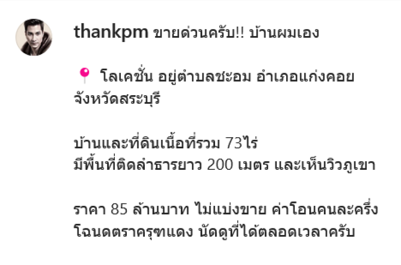 เรียกได้ว่าเป็นบ้านที่แฟนๆเห็นแล้วบอกว่า ร่มรื่นน่าอยู่มาก สำหรับบ้านของนักแสดงหนุ่มชื่อดัง แต๊งค์ พงศกร มหาเปารยะ ที่ล่าสุดเจ้าตัวได้โพสต์ในอินสตาแกรม thankpm ประกาศขายบ้านพร้อมที่ดินนเนื้อที่รวม 73 ไร่ ราคา 85 ล้านบาท โดยระบุว่า "ขายด่วนครับ!! บ้านผมเอง โลเคชั่น อยู่ตำบลชะอม อำเภอแก่งคอย จังหวัดสระบุรี บ้านและที่ดินเนื้อที่รวม 73 ไร่ มีพื้นที่ติดลำธารยาว 200 เมตร และเห็นวิวภูเขา ราคา 85 ล้านบาท ไม่แบ่งขาย ค่าโอนคนละครึ่ง โฉนดตราครุฑแดง นัดดูที่ได้ตลอดเวลาครับ"