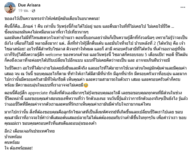 เรียกได้ว่าเป็นอีกหนึ่งครอบครัว ที่แฟนๆต่างเอ็นดู สำหรับครอบครัวของคุณแม่ ดิว อริสรา กับน้องไซลาส ในวัย 5 เดือน ที่ล่าสุดแม่ดิวก็ได้แจ้งข่าวแฟนๆ ว่าต้องพาลูกชาย ย้ายไปอยู่ไต้หวัน บ้านเกิดของสามี เซบาสเตียน ลี ชั่วคราวประมาณ 2 เดือน โดยเจ้าตัวได้โพสต์ในเฟซบุ๊ก Due Arisara โดยระบุว่า