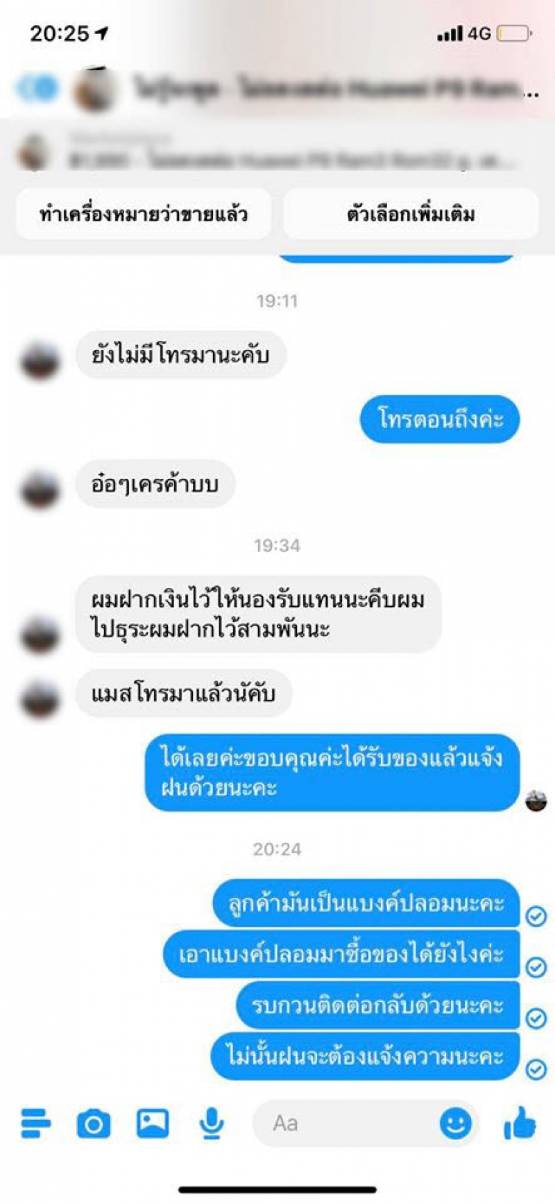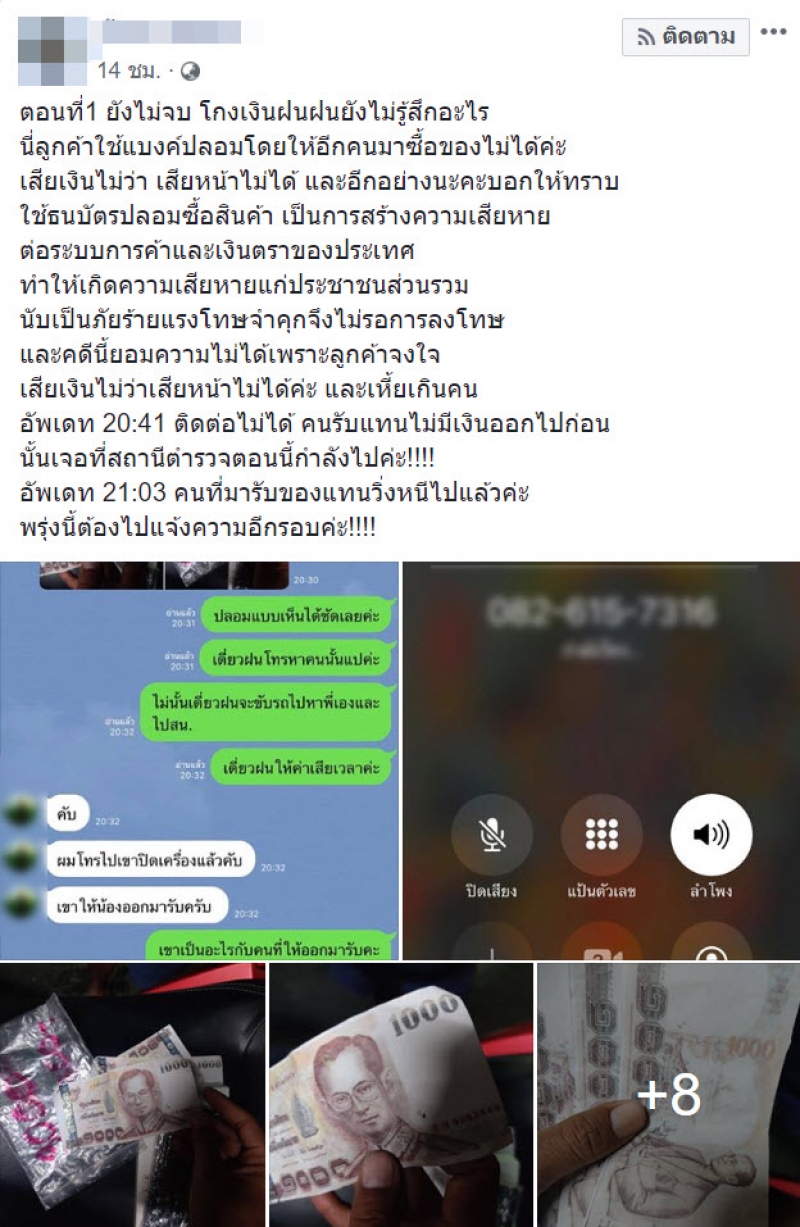 ยอมความไม่ได้เพราะลูกค้าจงใจเสียเงินไม่ว่าเสียหน้าไม่ได้ค่ะ และเหี้ยเกินคนอัพเดท 20:41 ติดต่อไม่ได้ คนรับแทนไม่มีเงินออกไปก่อนนั้นเจอที่สถานีตำรวจตอนนี้กำลังไปค่ะ อัพเดท 21:03 คนที่มารับของแทนวิ่งหนีไปแล้วค่ะพรุ่งนี้ต้องไปแจ้งความอีกรอบค่ะ