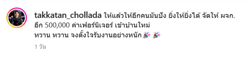 ล่าสุดสาวตั๊กแตนก็ได้เปย์หนักอีกแล้ว โดยคราวนี้ได้ให้เงินเพิ่มอีก 5 แสนบาท เพื่อนำไปซื้อเฟอร์นิเจอร์ใหม่เข้าบ้าน โดยสาวตั๊กแตนได้ระบุว่า ให้แล้วให้อีกคนมันปัง ยิ่งให้ยิ่งได้ จัดให้ ผจก. อีก 500,000 ค่าเฟอร์นิเจอร์ เข้าบ้านใหม่ หวาน หวาน จงตั้งใจรับงานอย่างหนัก