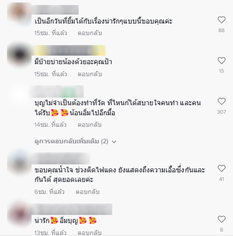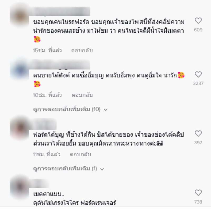 โดยหลังจากที่ได้มีการโพสต์คลิปออกไป ก็มีชาวโซเชียลเข้ามาแสดงความคิดเห็นชื่นชมกันเพียบ อาทิเช่นขอบคุณคนในรถฟอร์ด ขอบคุณเจ้าของโพสนี้ที่ส่งคลิปความน่ารักของคนและช้าง มาให้ชม ว่า คนไทยใจดีมีน้ำใจมีเมตตา,คนขายได้ตังค์ คนซื้ออิ่มบุญ คนรับอิ่มพุง คนดูอิ่มใจ น่ารัก,ฟอร์ดได้บุญ พี่ช้างได้กิน ป้สได้ขายของ เจ้าของช่องได้คลิป ส่วนเราได้รอยยิ้ม ขอบคุณมิตรภาพระหว่างทางค่ะ