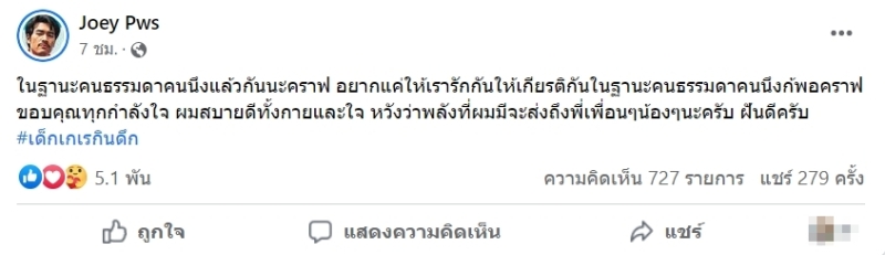 ซึ่งต่อมา โจอี้ ภูวศิษฐ์ ก็ได้ออกมาเคลื่อนไหวเป็นครั้งแรกผ่านทางเฟซบุ๊ก Joey Pws โดยเจ้าตัวได้โพสต์ข้อความระบุว่า "ในฐานะคนธรรมดาคนนึงแล้วกันนะคราฟ อยากแค่ให้เรารักกันให้เกียรติกันในฐานะคนธรรมดาคนนึงก็พอคราฟขอบคุณทุกกำลังใจ ผมสบายดีทั้งกายและใจ หวังว่าพลังที่ผมมีจะส่งถึงพี่เพื่อนๆน้องๆ นะครับ ฝันดีครับ #เด็กเกเรกินดึก