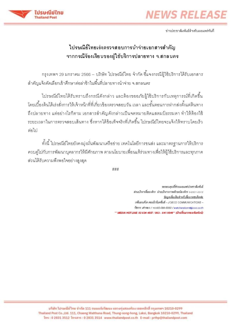 ไปรษณีย์ไทยได้รับทราบถึงกรณีดังกล่าวและต้องขออภัยผู้ใช้บริการกับเหตุการณ์ที่เกิดขึ้น เบื้องต้นสั่งเร่งให้เจ้าหน้าที่ตรวจสอบ วัน เวลาและขั้นตอนการฝากส่งตั้งแต่ต้นทางถึงปลายทาง อย่างไรก็ตามเอกสารสำคัญดังกล่าวเป็นจดหมายติดแสตมป์ธรรมดา ทำให้ต้องใช้ระยะเวลาในการตรวจสอบเส้นทาง หากได้ข้อเท็จจริงที่เกิดขึ้น ไปรษณีย์ไทยจะแจ้งให้ทราบโดยเร็ว