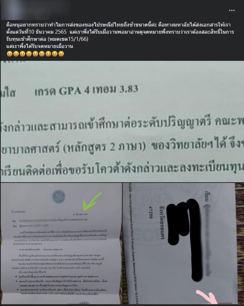 ความคืบหน้าจากกรณีที่มีสาวคนหนึ่ง ได้ออกมาร้องเรียนโดยได้โพสต์ระบุว่า "คือหนูอยากทราบว่าทำไมการส่งของของไปรษณีย์ไทยถึงช้าขนาดนี้ค่ะ คือทางมหาลัยได้ส่งเอกสารให้เราตั้งแต่วันที่ 10 ธันวาคม 2565 แต่เราเพิ่งได้รับเมื่อวานพอมาอ่านดูจดหมาย เพิ่งทราบว่าเราต้องสละสิทธิ์ในการรับทุนเข้าศึกษาต่อ (หมดเขต15/1/66) แต่เราเพิ่งได้รับจดหมายเมื่อวาน (28 ม.ค.)"