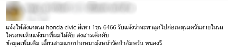 ความคืบหน้าจากกรณีที่เมื่อวานนี้ ชาวโซเชียลประกาศช่วยกันตามหาด่วน รถยนต์ฮอนด้าซีวิค หมายทะเบียน สีเทา 1ขร 6466 ภายในรถมีเด็กนักเรียนชายเจ้าหน้าที่ได้รับแจ้งเหตุว่าคนขับรถกำลังจะไปก่อเหตุ ตามรายงานก่อนหน้า คนขับมุ่งหน้าไปทางวัดป่าอัมพวัน หนองรี จ.ชลบุรี เจ้าหน้าที่ตำรวจกำลังตามหา แต่ยังไม่พบ หากใครพบเห็น สามารถแจ้ง 1669 / 191 หรือเจ้าหน้าที่ที่เกี่ยวข้อง ได้ทันที