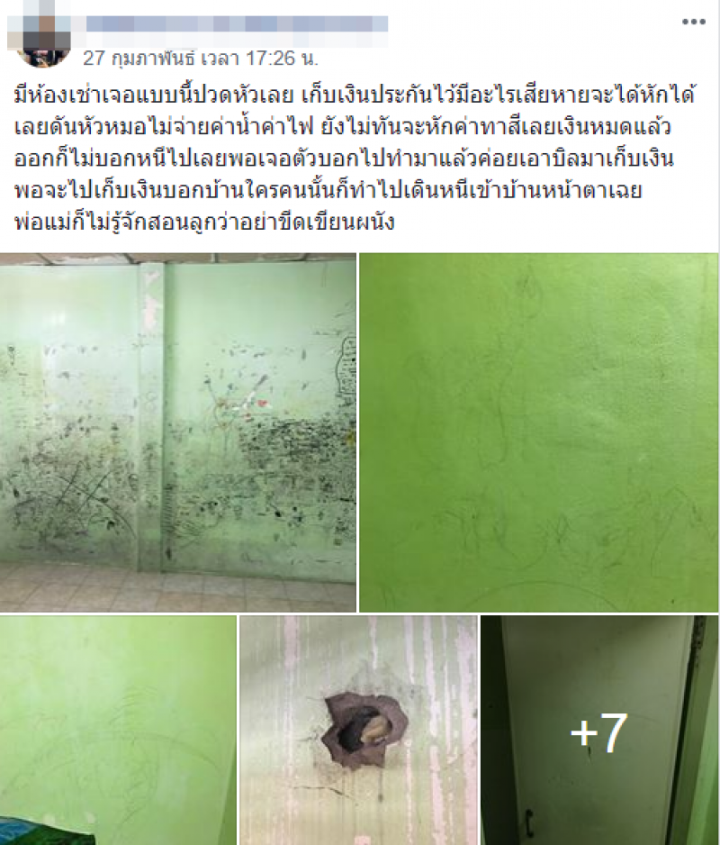 เมื่อวันที่ 27 กุมภาพันธ์ 63 ที่ผ่านมาผู้ใช้เฟซบุ๊กรายหนึ่งได้ออกมาโพสต์ข้อความของภาพห้องเช่าที่บอกเลยว่าเกินรับไหว หลังจากเค้ารับห้องคืนได้เข้าไปตรวจสอบสภาพเห็นปกติแต่กลับต้องกุมขมับเมื่อเห็นงานศิลปะ บนผนังห้องถูกวาดเป็นตัวอักษรและรูปต่างๆอยู่เต็มไปหมดนอกจากนี้ยังมีกระจกหน้าต่างที่แตกออกและกพแพงที่ถูกเจาะเป็นรูขนาดใหญ่จนสามารถยัดผ้าเข้าไปได้ โดยผู้ใช้เฟซบุ๊กรายนี้ยังได้โพสต์ระบายความรู้สึกว่า