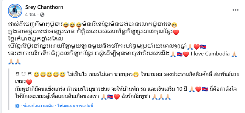 ต่อมาทางด้าน Srey Chanthorn รองประธานกิตติมศักดิ์สหพันธ์มวยกัมพูชา ได้แชร์คลิป บทสัมภาษณ์ของ บัวขาว พร้อมระบุข้อความว่า "ไม่เป็นไร กัมพูชา ก็ไม่เอา นายบัวขาว ในนามผมรองประธานกิตติมศักดิ์สหพันธ์มวยกัมพูชา คนเขมรก็แข็งแกร่ง"