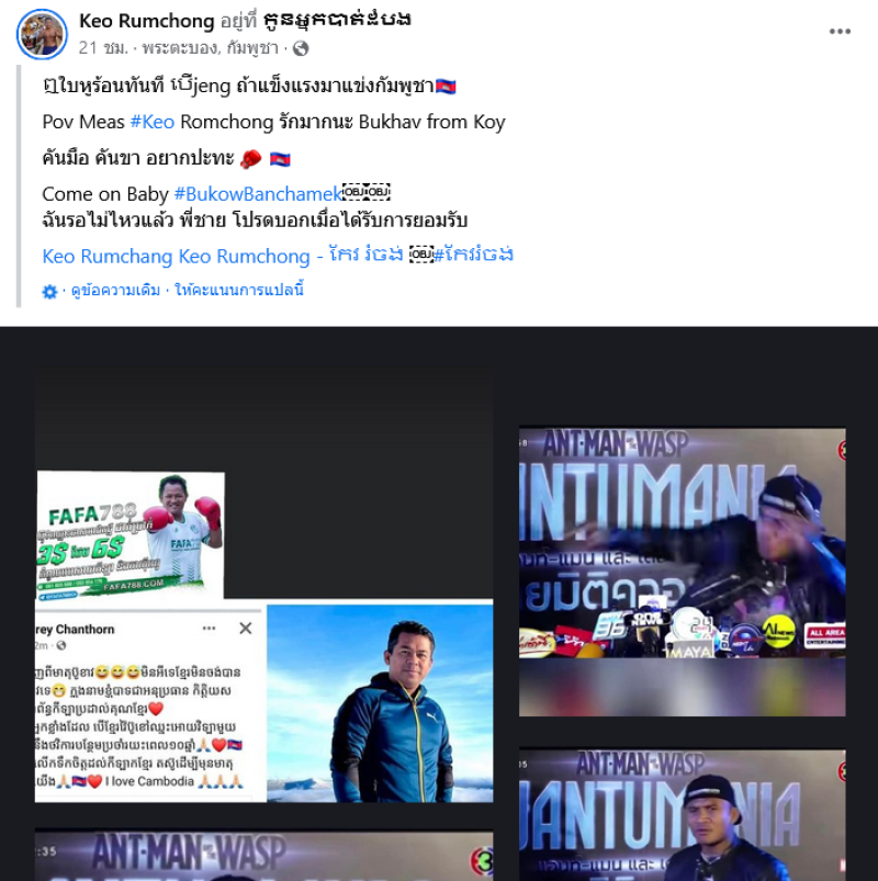 ล่าสุดทางด้าน Keo Rumchong นักมวยชาวกัมพูชา ที่เคยมาแข่งในประเทศไทย ก็ได้มีการออกมาเคลื่อนไหว หลังได้เห็นคลิปสัมภาษณ์ของบัวขาว ซึ่งทำเอาเจ้าตัวถึงกับทนไม่ไหว อยากเจอกับบัวขาว