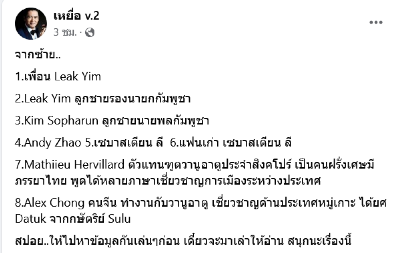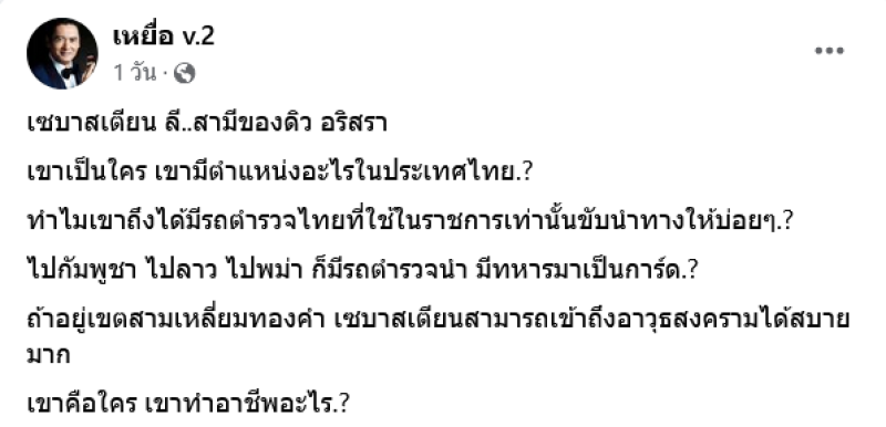 จากกรณีที่เฟซบุ๊กเพจดัง ได้มีการออกมาเผยข้อสงสัยถึง เซบาสเตียน ลี..สามีของดิว อริสรา เขาเป็นใคร เขามีตำแหน่งอะไรในประเทศไทย.? ทำไมเขาถึงได้มีรถตำรวจไทยที่ใช้ในราชการเท่านั้นขับนำทางให้บ่อยๆ.? ไปกัมพูชา ไปลาว ไปพม่า ก็มีรถตำรวจนำ มีทหารมาเป็นการ์ด.พร้อมกับมีภาพของ เซบาสเตียน ลี ใกล้ชิดกับลูกคนใหญ่คนโตกัมพูชา