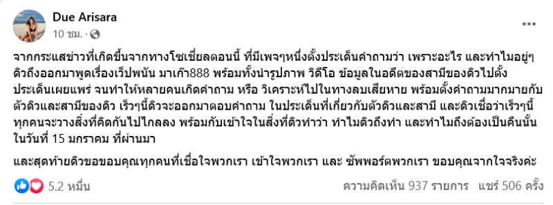 ล่าสุดทางด้าน ดิว อริสรา ก็ได้มีการโพสต์ชี้แจงกรณีมีคนไปขุดภาพคลิปของ เซบาสเตียน สามีในอดีตมาเผยแพร่จนมีการตั้งคำถามต่างๆ นานา ไปในทางลบเสียหาย และตั้งคำถามทำไมอยู่ๆดิวถึงออกมาพูดเรื่องเว็บพนัน มาเก๊า888 ผ่านเฟซบุ๊กส่วนตัว