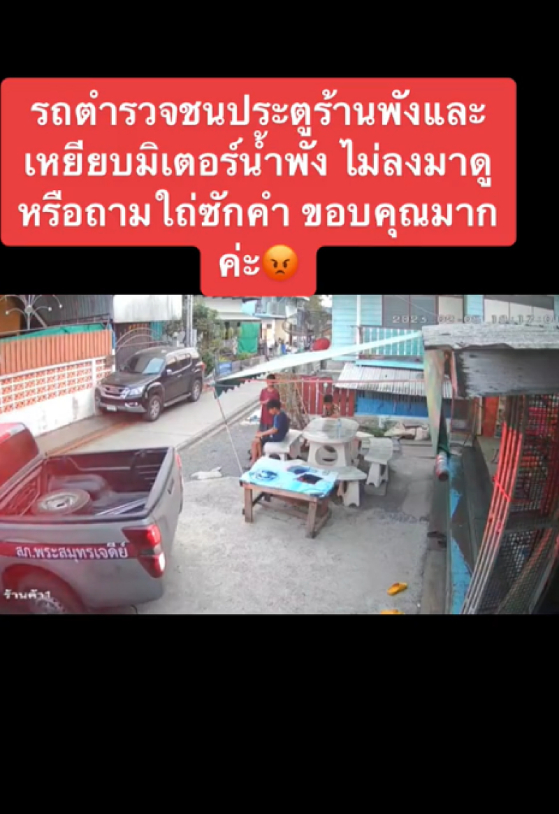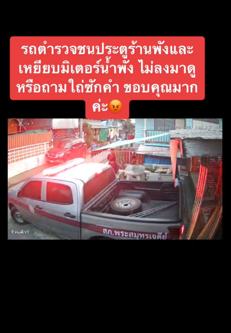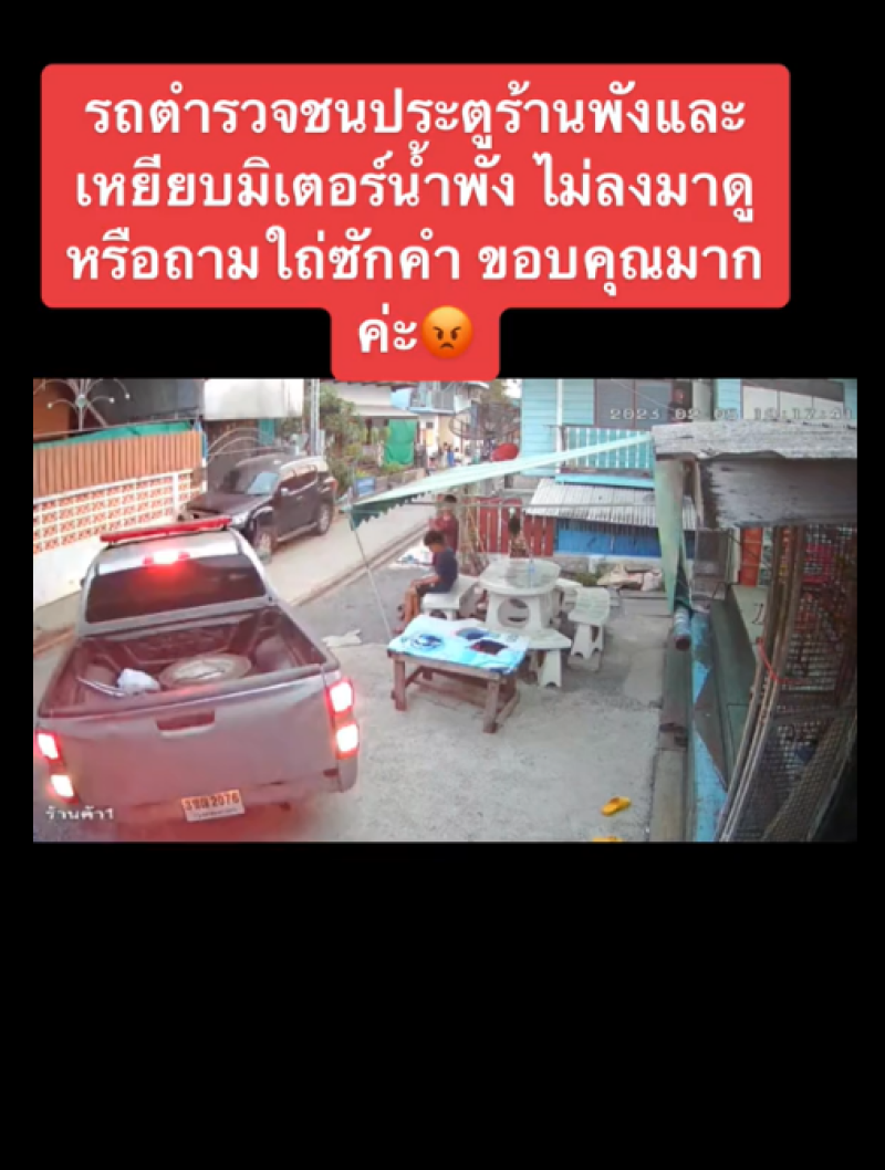 กลายเป็นอีกหนึ่งเหตุการณ์ที่เรียกเสียงวิพากษ์วิจารณ์เป็นอย่างมาก หลังจากที่ผู้ใช้บัญชี tiktok รายหนึ่งได้มีการโพสต์คลิปจากกล้องวงจรปิด ขณะที่มีรถกระบะของตำรวจ ถอยหลังกลับรถที่หน้าร้านค้าในหมู่บ้านแห่งหนึ่ง ซึ่งรถตำรวจได้ถอยไปโดนประตูหน้าร้าน และ เหยีบมิเตอร์น้ำ ได้รับความเสียหาย แต่ทว่าตำรวจกลับไม่ลงมาดูไม่ขอโทษ แล้วก็ขับรถไปโดนไม่สนใจ ซึ่งที่รถกระบะมีการระบุชื่อ สถานีตำรวจเอาไว้อย่างชัดเจน