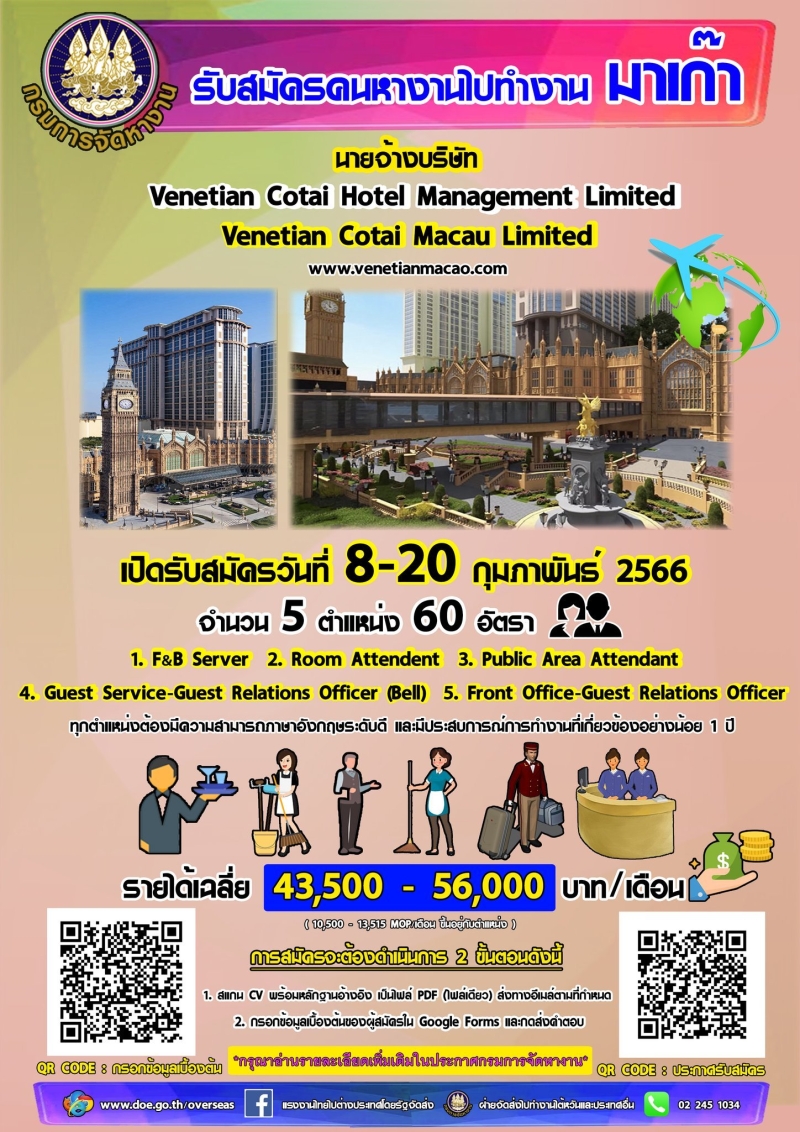เมื่อวันที่ 7 กุมภาพันธ์ 2566 ที่ผ่านมา ในเฟซบุ๊กเพจเพจ กรมการจัดหางาน เผยแพร่ประกาศ รับสมัครคนหางานเพื่อไปทำงานในเขตบริหารพิเศษมาเก๊า กับนายจ้างบริษัท Venetian Cotai Hotel Management Limited และ Venetian Macau Limited