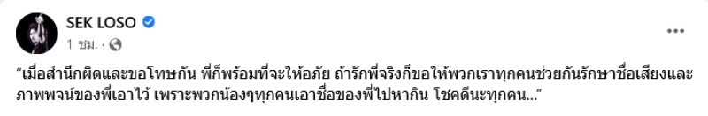 ล่าสุดในเฟซบุ๊กเพจ SEK LOSO ก็ได้มีการเคลื่อนไหวอีกครั้ง โดยระบุว่า "เมื่อสำนึกผิดและขอโทษกัน พี่ก็พร้อมที่จะให้อภัย ถ้ารักพี่จริงก็ขอให้พวกเราทุกคนช่วยกันรักษาชื่อเสียงและภาพพจน์ของพี่เอาไว้ เพราะพวกน้องๆทุกคนเอาชื่อของพี่ไปหากิน โชคดีนะทุกคน" พร้อมกับมีภาพของ เสก โลโซ ยกมือรับไหว้ให้อภัย