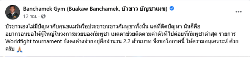 กัมพูชาไม่มีเงินจ่ายค่าตัวบัวขาว แม้แต่บาทเดียวก็ไม่มี รบกวนพี่น้องชาวไทยที่ทักแชตเพจผม สหพันธ์เขมรไม่ได้เอาเงินของบัวขาวไป โปรดอ่านว่าการนําเสนอคืออะไรและอธิบายความจริงด้านล่าง