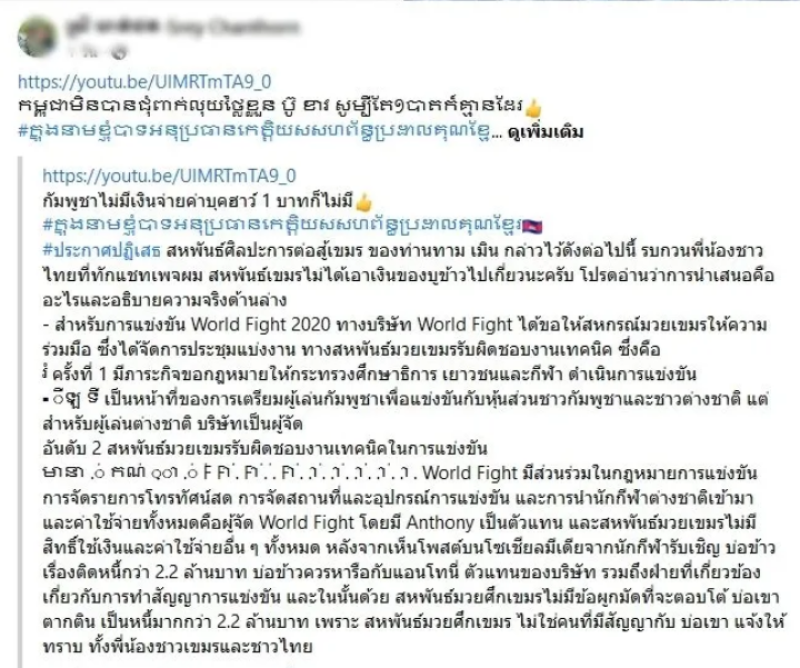ต่อมาทางด้าน สเร จันทร ได้โพสต์ชี้แจงในเฟซบุ๊กส่วนตัวเกี่ยวกับเรื่องค่าตัวของยอดมวยชาวไทยว่า