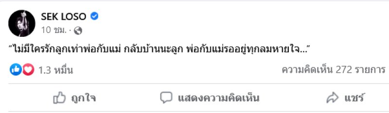 ในขณะที่ทางด้าน เสก โลโซ ก็ได้มีการเคลื่อนไหวถึงลูกชาย โดยระบุว่า "ไม่มีใครรักลูกเท่าพ่อกับแม่ กลับบ้านนะลูก พ่อกับแม่รออยู่ทุกลมหายใจ"