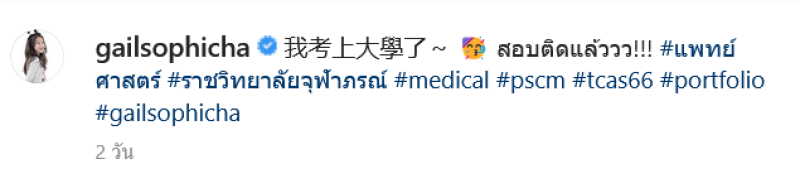 ล่าสุดน้องเกล ได้เปิดผลการสอบติดเเพทย์ โดยได้มีการโพสต์ไว้ในอินสตาแกรม gailsophicha โดยน้องเกลติดแพทย์ของ คณะเเพทยศาสตร์ วิทยาลัยวิทยาศาสตร์ศรีสวางควัฒนแพทย์ศาสตร์ ราชวิทยาลัยจุฬาภรณ์ ซึ่งก็มีแฟนๆเข้ามาให้กำลังใจชื่นชมกันเพียบ