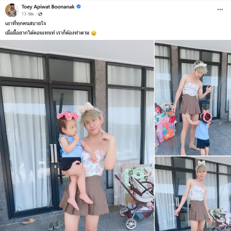 ล่าสุดในเฟซบุ๊กของครูเต้ย Toey Apiwat Boonanak ก็ได้มีการโพสต์ภาพโมเมนต์น่ารักๆในครอบครัว เมื่อคุณแม่อยากได้คอนเทนต์ คุณพ่อก็จัดให้ตามคำขอ แปลงโฉมเป็นผู้หญิงตามที่ต้องการ บอกเลยว่าเห็นครูเต้ยในลุคนี้แล้วดูมุ้งมิ้งมาก ไม่รู้ว่างานนี้ลูกสาวจะงงหรือเปล่านะว่าเป็นคุณพ่อหรือแม่